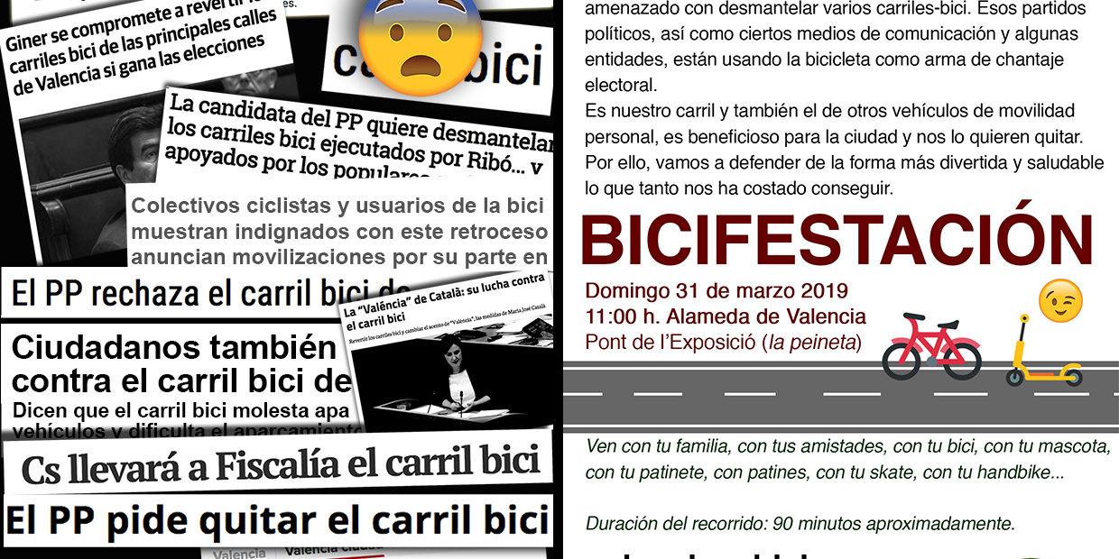 En las últimas semanas algunos partidos políticos han amenazado con desmantelar ciertos carriles-bici en caso de llegar al gobierno local en mayo. Eliminar carriles-bici ya construidos, o actualmente en construcción, supondría un freno al uso de la bicicleta en nuestra ciudad. Esos partidos políticos, así como ciertos medios de comunicación y algunas entidades sociales, tratan de presentar a la bicicleta como un problema para la ciudad de València.