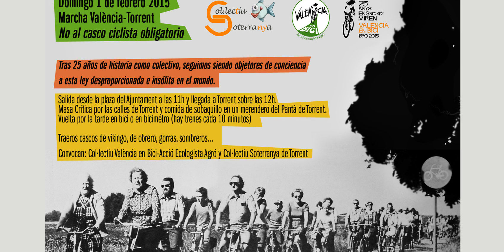 «No al casco ciclista obligatorio». Salida desde la plaza del Ajuntament a las 11h y llegada a Torrent sobre las 12h. Masa Crítica por las calles de Torrent y comida de sobaquillo en un merendero del Pantà de Torrent. Vuelta por la tarde en bici o en bicimetro ( hay trenes cada 10 minutos ).