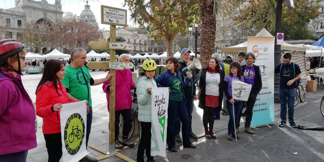 Lo hemos hecho aprovechando que en la plaza del Ayuntamiento se celebraba el mercado de productos hortofrutícolas de l’Horta y allí hemos plantado el poste del que debería ser el punto cero de esa red en el área metropolitana de València (Xarxa metropolitana no motoritzada). Tras ello, un centenar de bicicleteras y bicicleteros nos hemos dirigido por los carriles bici hechos en esta legislatura, quitando espacio al coche y no al peatón (Anell Ciclista, carril de Padre Ferris, Avª Burjassot) hasta la Huerta de Burjassot, donde hemos plantado en un cruce de caminos el segundo poste de esa futura red.